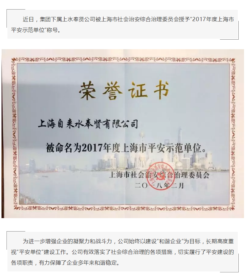 上水奉贤公司被授予“2017年度上海市平安示范单位”称号