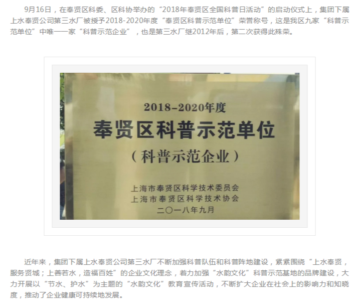上水奉贤公司第三水厂获得“奉贤区科普示范单位”荣誉称号