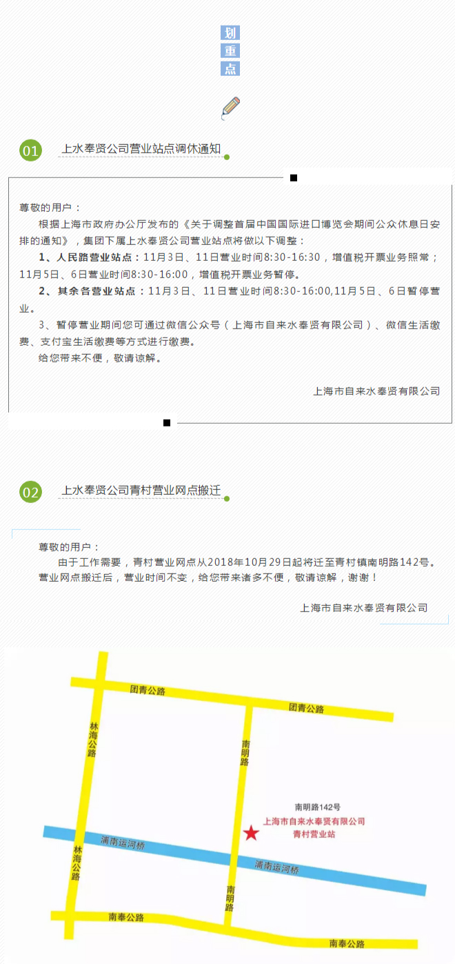 上水奉贤:营业站点调休&青村营业网点搬迁通知