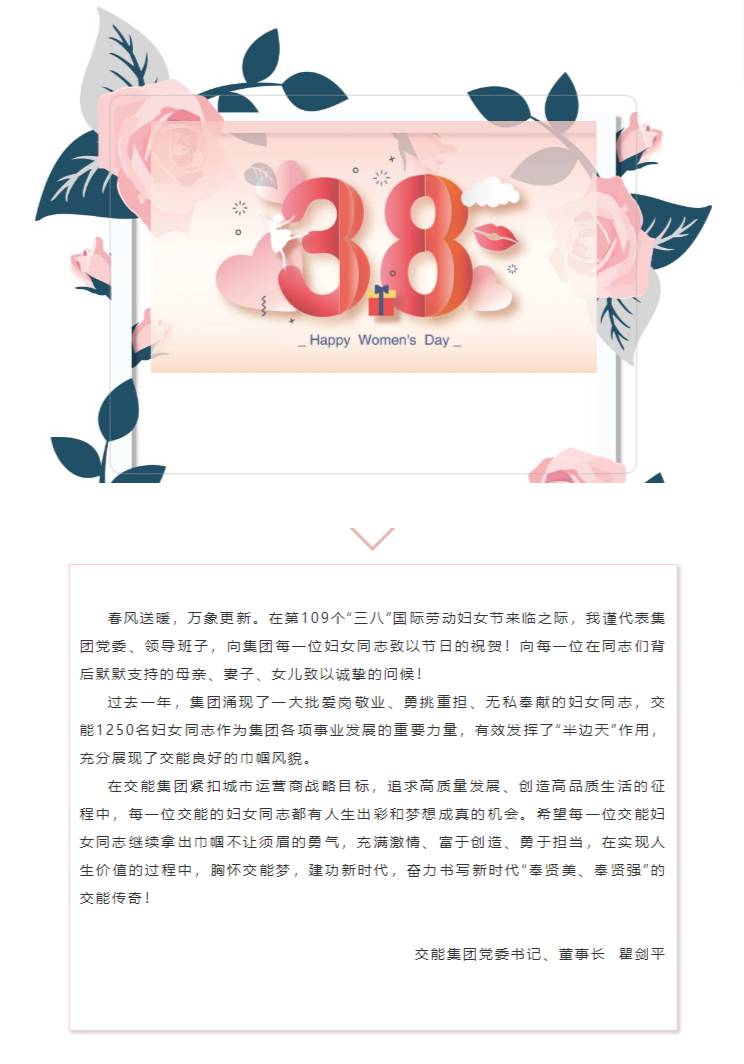 交能集团党委书记、董事长瞿剑平祝妇女同志节日快乐!