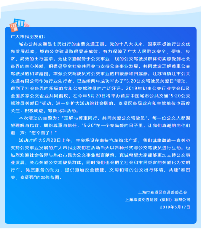 中国城市公共交通2019年首届 “5·20公交驾驶员关爱日”活动公开信