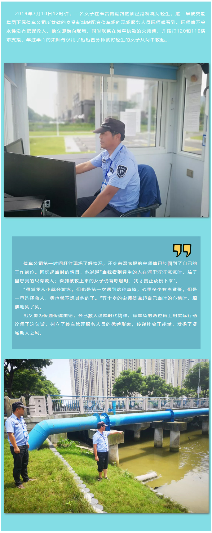 点赞!奉贤新城停车场收费员跳入河中英勇救人
