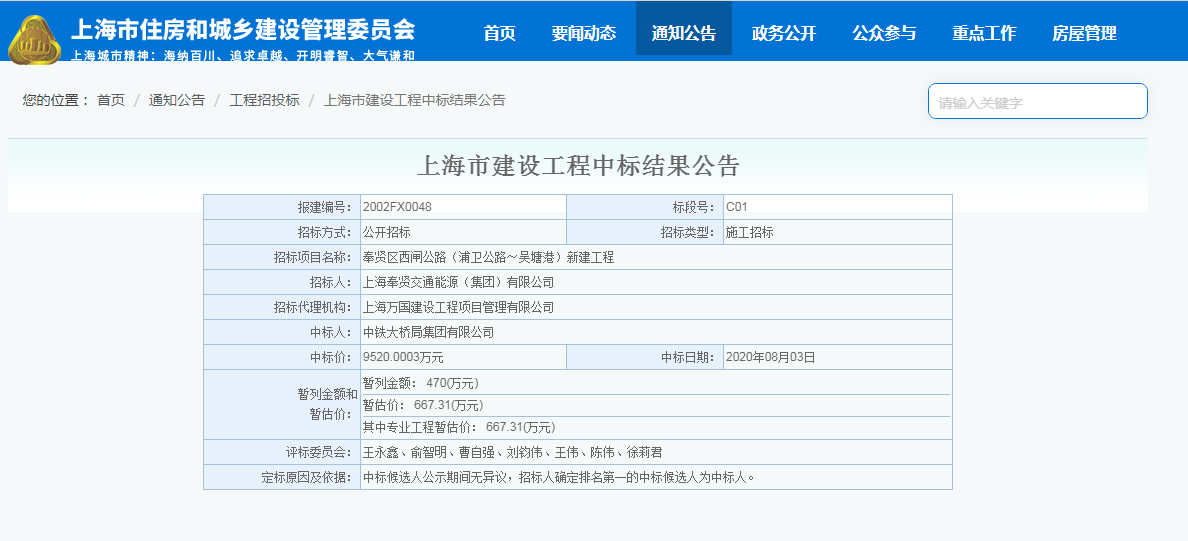 奉贤区西闸公路(浦卫公路~吴塘港)新建工程 C01标段 中标公告