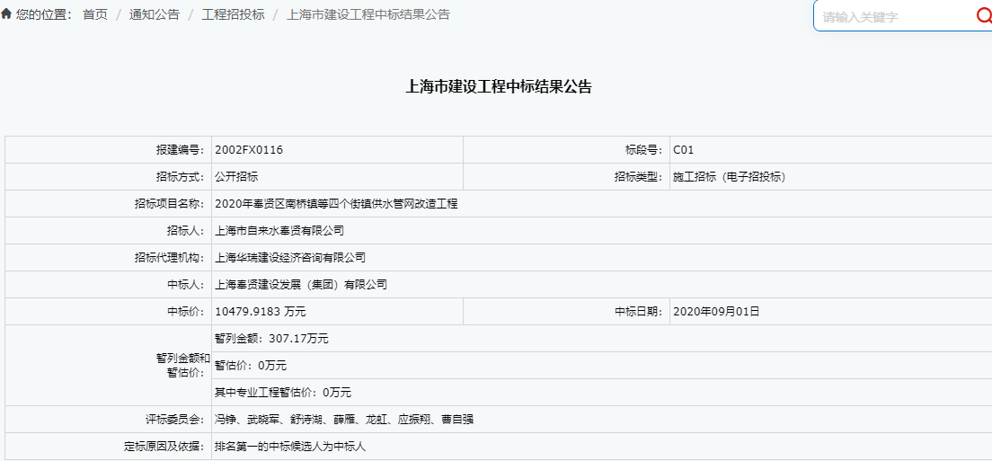 2020年奉贤区南桥镇等4个街镇供水管网改造工程 施工中标公告